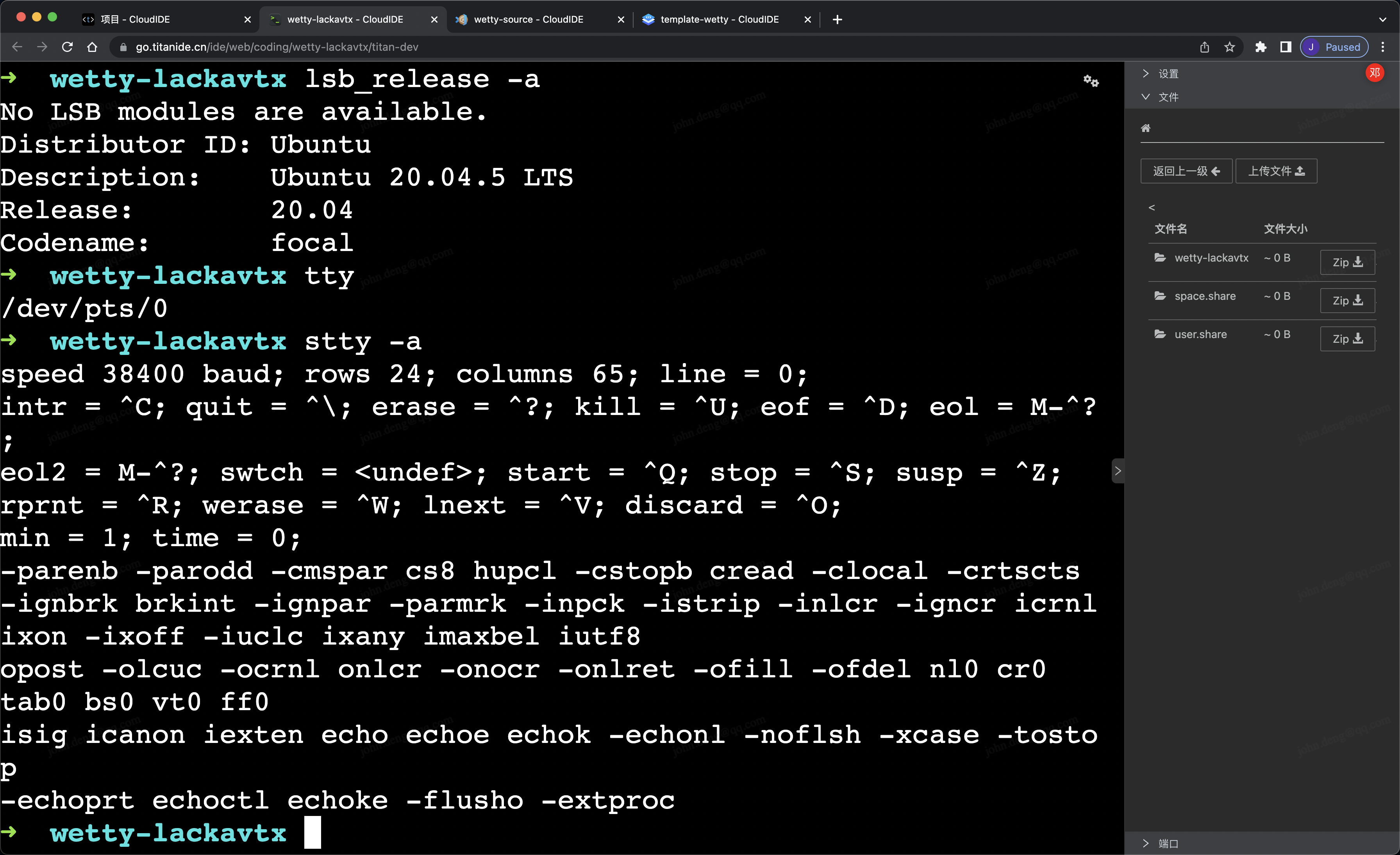 最后,使用 WeTTY 模版来创建 WeTTY 项目。验证最终效果,如下图所示。