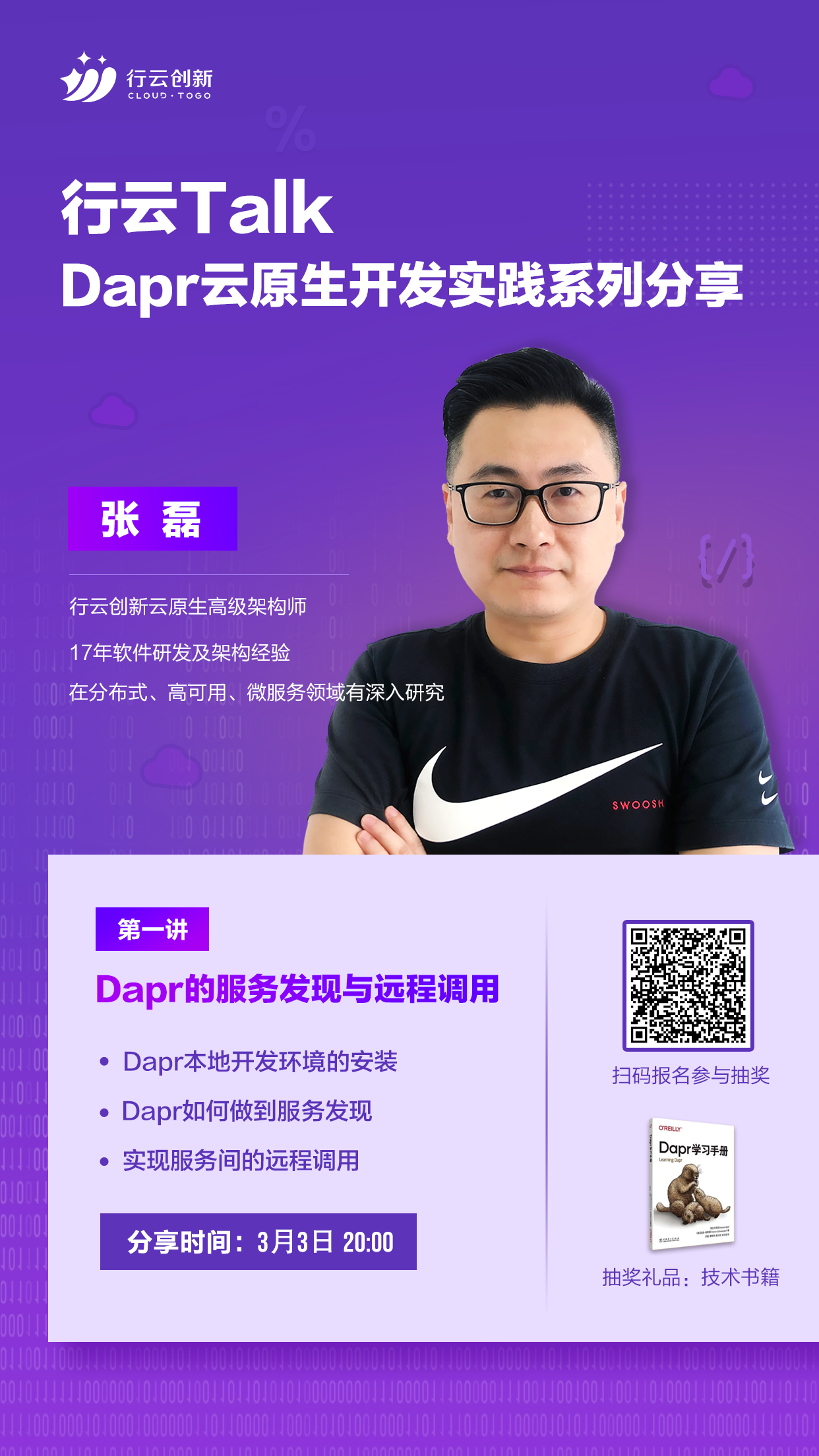 3月3日20:00,Dapr云原生开发实践系列第一期内容即将开讲,KY.COM-开云(中国)创新云原生高级架构师张磊分享:Dapr的服务发现和远程调用,介绍Dapr本地开发环境的安装,Dapr如何做到服务发现以及实现服务间的远程调用。
