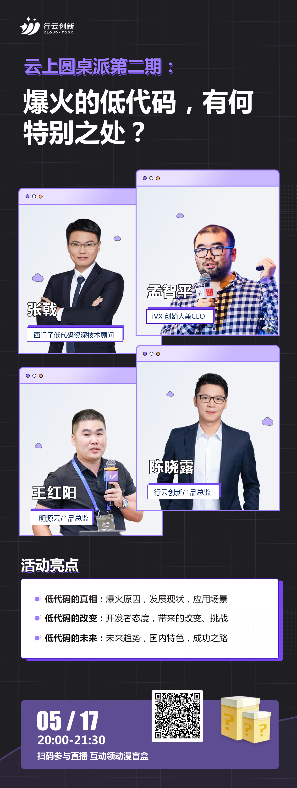 5月17日20:00《云上圆桌派第二期:爆火的低代码,有何特别之处》直播来啦!活动邀请西门子工业软件西门子低代码资深技术顾问张戟,iVX 创始人兼CEO孟智平,明源云产品总监王红阳,KY.COM-开云(中国)创新产品总监陈晓露四位大咖和KY.COM-开云(中国)创新CEO马洪喜一起对低代码爆火背后的原因、开发者对低代码的态度、低代码带来的变化和应用场景等多个话题展开讨论。
