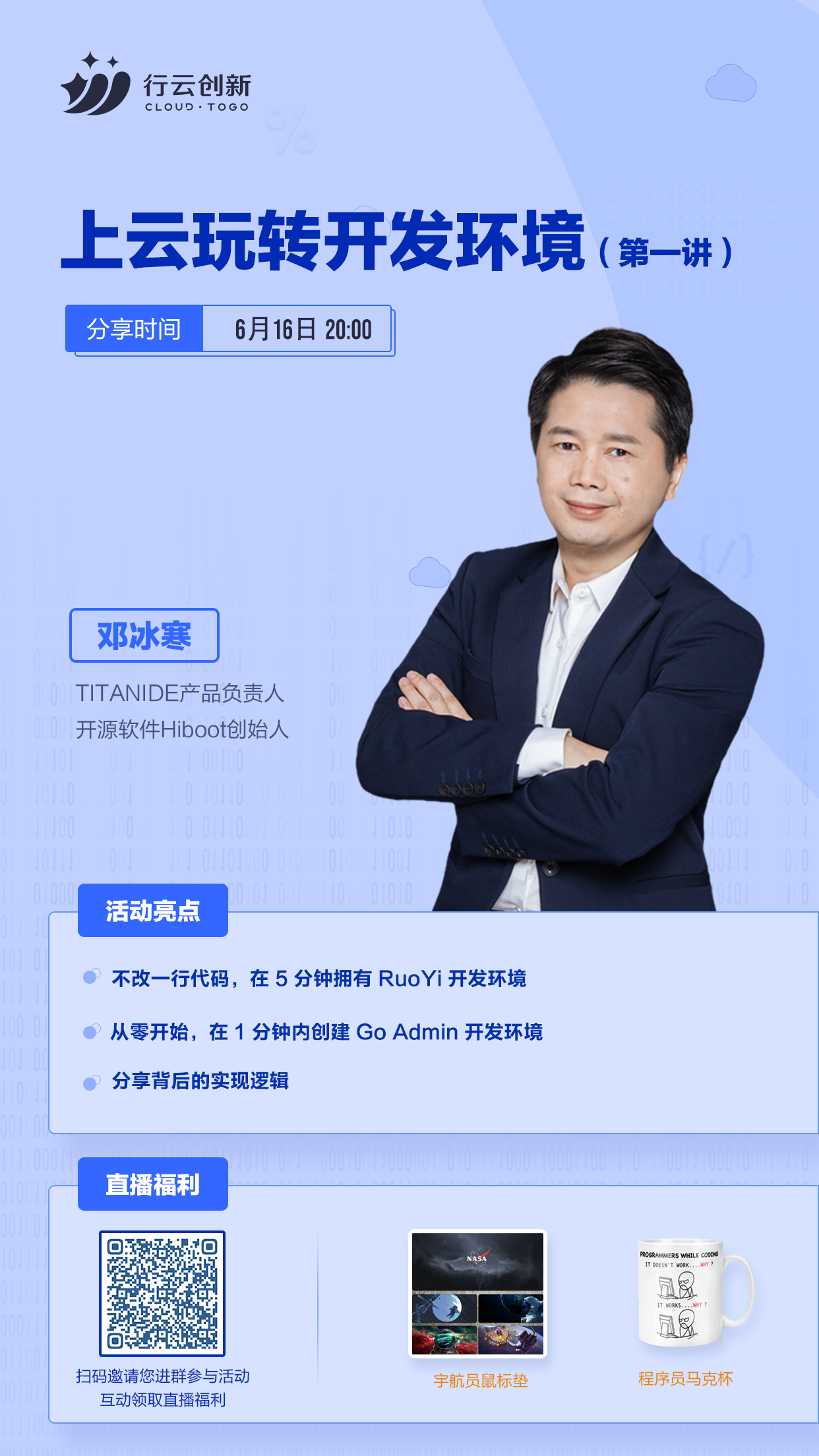 6月16日20:00,“上云玩转开发环境”第一讲即将开启!KY.COM-开云(中国)创新 TitanIDE 产品负责人邓冰寒将分享:如何利用 TitanIDE 在不改一行代码情况下,在5分钟拥有 RuoYi 开发环境;如何从零开始,在1分钟内创建 Go Admin 开发环境;以及分享这背后的实现逻辑。直播间还会送出宇航员鼠标垫、程序员马克杯等福利,快扫码参与活动吧~