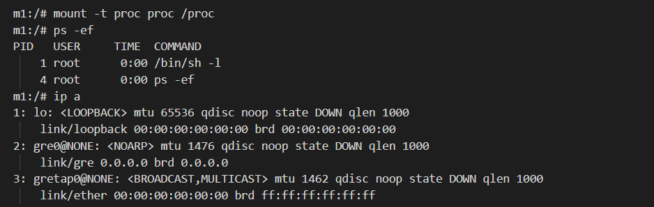 好了,我们再次挂载文件系统/proc,查看这个容器。
